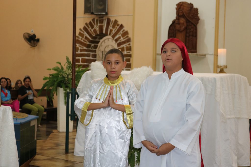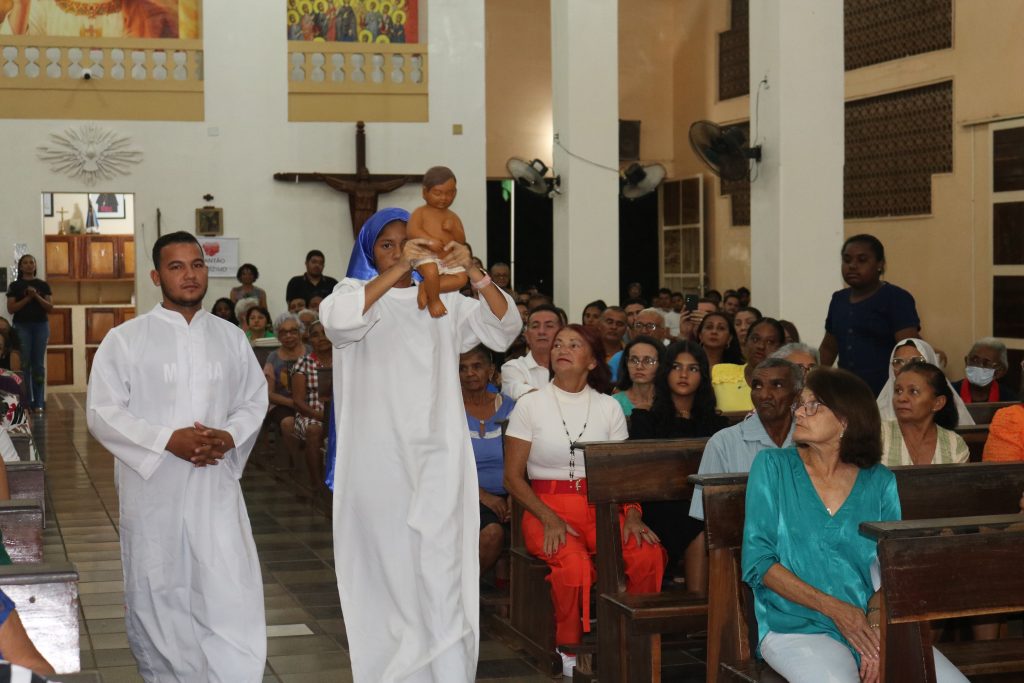 A celebração ganhou ainda mais vida com uma encenação tocante de Nossa Senhora expondo seu filho Jesus, apresentada pelo Grupo de Oração Jovens Conectados Maranathá. Os membros do grupo dedicaram tempo e esforço para criar uma representação emocionante que tocou os corações dos presentes.