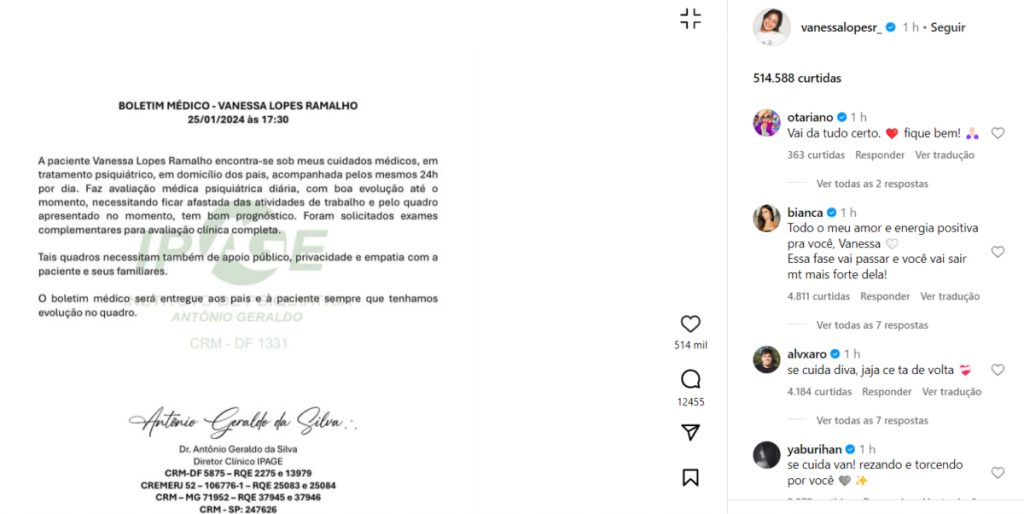 Por fim, o boletim médico pediu para que o público respeitasse a privacidade de Vanessa, já que se trata de um momento delicado na vida da influenciadora. “Tais quadros necessitam também de apoio público, privacidade e empatia com a paciente e seus familiares. O boletim médico será entregue aos pais e à paciente sempre que tenhamos evolução no quadro”, disse o comunicado.