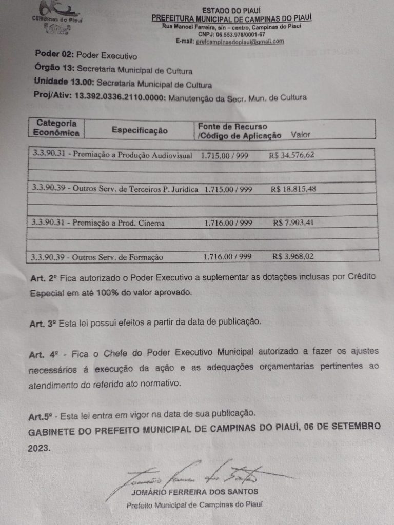 Na cidade de Campinas do Piauí, um novo capítulo da atuação política local marcou a sessão extraordinária realizada na noite de terça-feira, 19 de setembro de 2023. O prefeito Jomário Ferreira dos Santos apresentou, em caráter de urgência no dia 15 de setembro, um Projeto de Lei que tratava da utilização de crédito adicional de recursos da “Lei Paulo Gustavo”, destinada a incentivar a cultura no município. Contudo, assim como aconteceu com o Projeto de Lei referente ao Piso Salarial da Enfermagem, este também ficou inicialmente em tramitação para ser analisado pelos vereadores. A falta de tempo suficiente para que o projeto fosse lido, estudado e analisado pelos vereadores, devido à sua tramitação em regime de urgência foi a justificativa para o projeto ser votado na sessão posterior, coordenada pelo presidente da câmara, Vereador Manoel Pereira da Silva. No entanto, a sessão extraordinária realizada na noite de terça-feira trouxe uma reviravolta na decisão.
