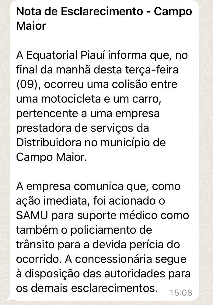 Em nota, a Equatorial informou que, ‘como ação imediata, foi acionado o SAMU para suporte médico como também o policiamento de trânsito para a devida perícia do ocorrido’.