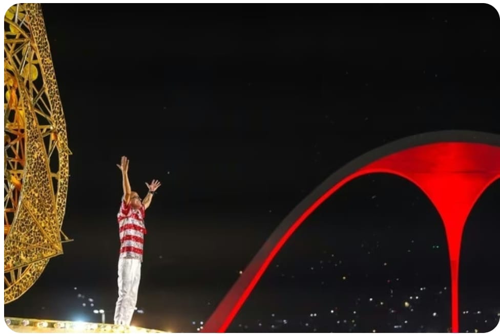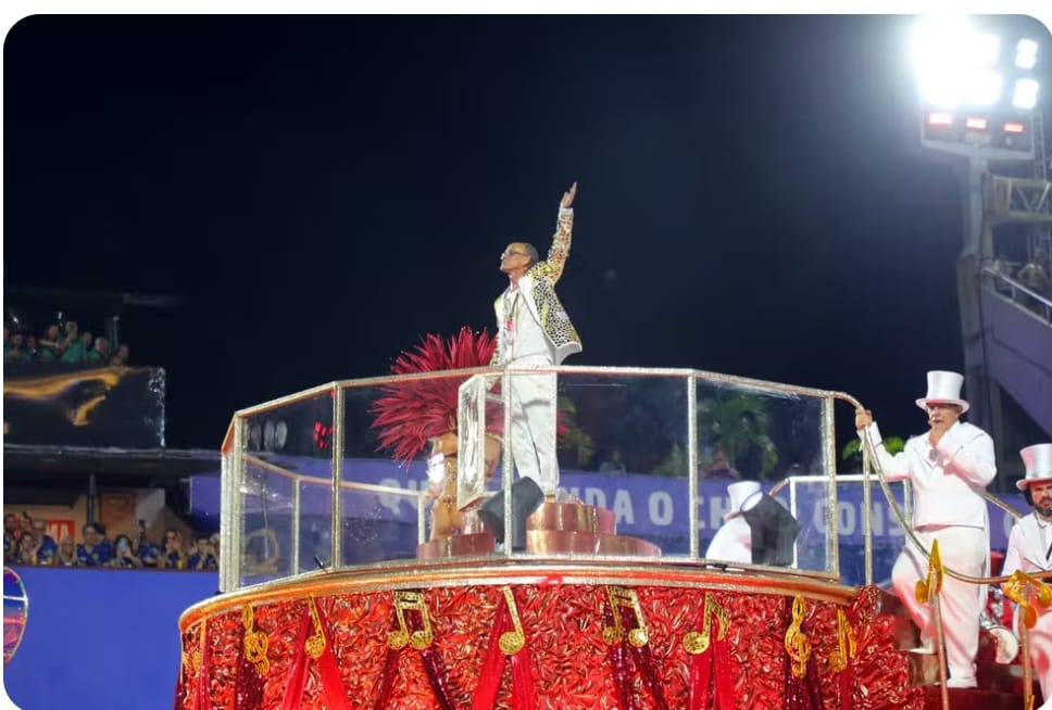O mestre, na sequência, subiu o tripé da comissão de frente, um grande apito estilizado que se transformou nos arcos da Apoteose. Encerrando a encenação, um elevador levantou Ciça para o alto da estrutura.