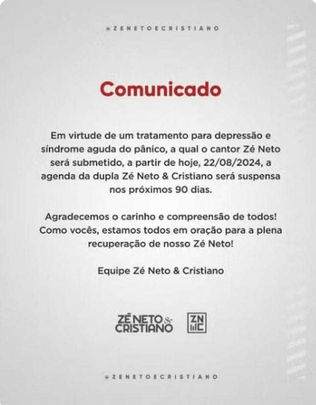 O comunicado foi feito no perfil oficial da dupla nas redes sociais. “Agradecemos o carinho e a compreensão de todos. Como vocês, estamos todos em oração para a plena recuperação do nosso Zé Neto”, diz o texto.